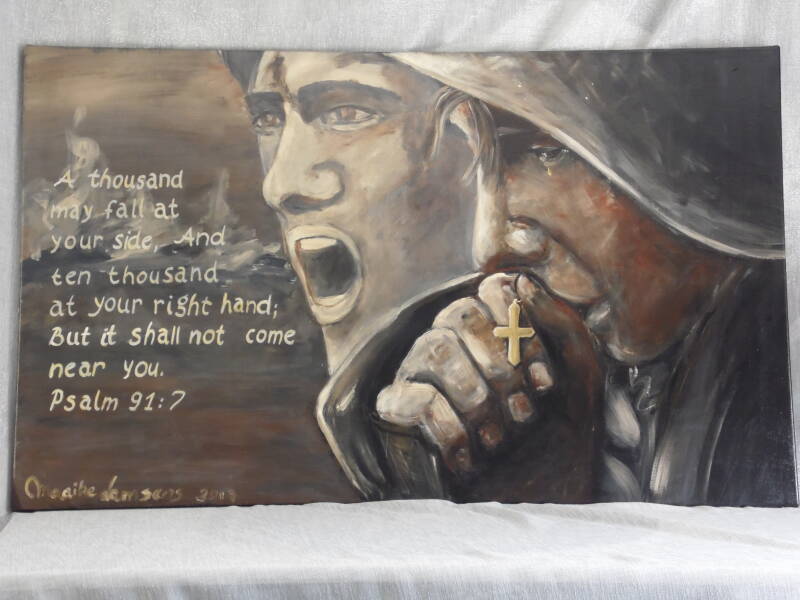 Men zegt wel eens, een foto zegt meer dan woorden. Maar Gods Woord zegt, dat Jezus ‘Woord’ is geworden, het Woord van God. EN de getuigenis van Jezus (= Het Woord van God) is de Geest van profetie. Dus, waar die tekst ook uithangt dat ik heb geschilderd, het produceert wat er staat geschreven. AMEN