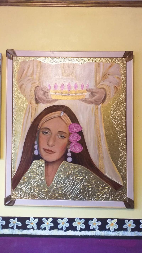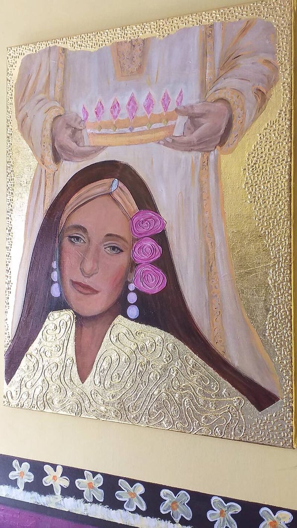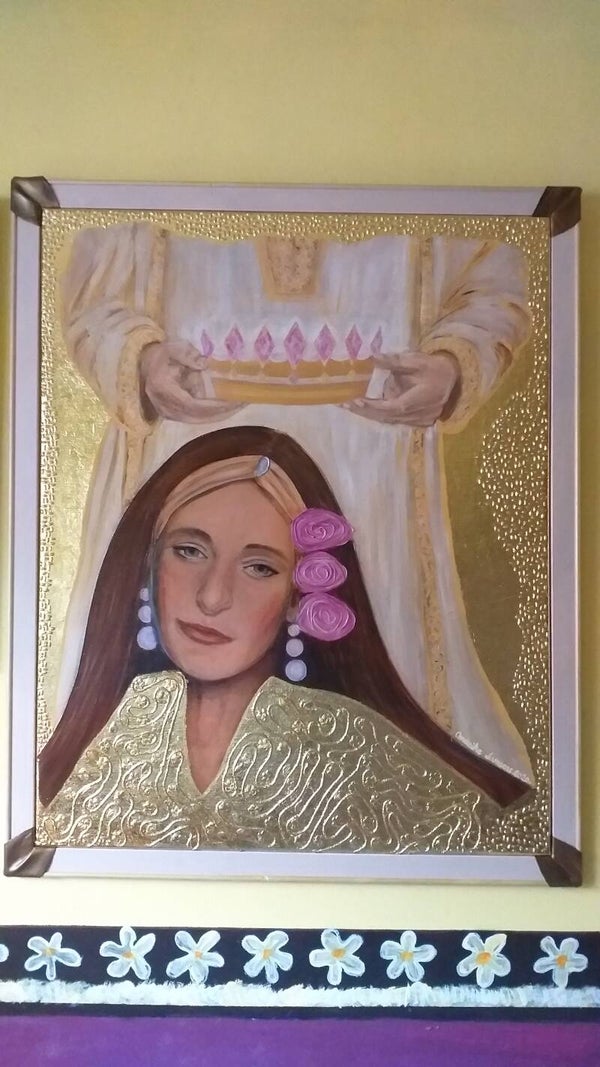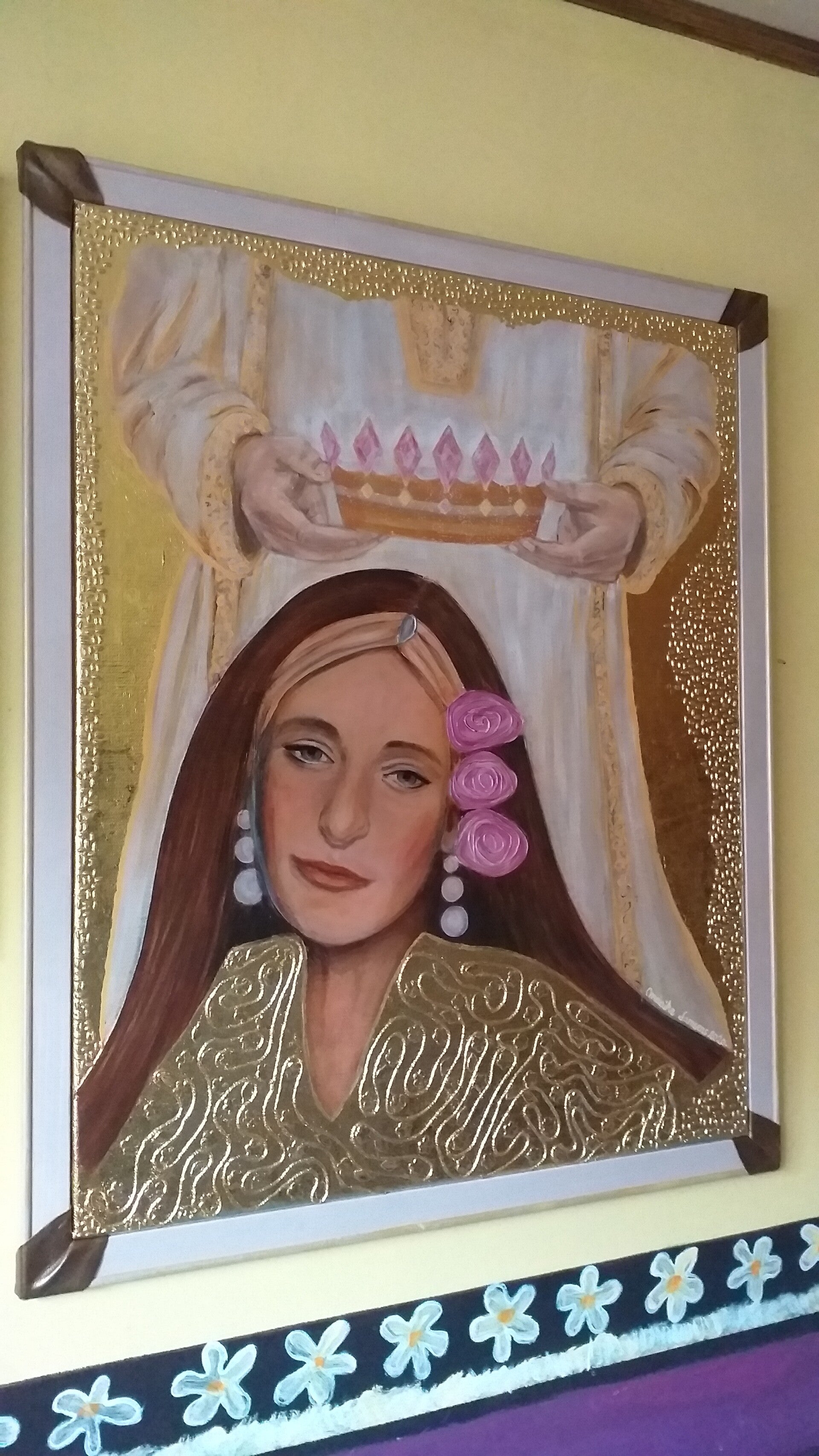 100 cm op 80 cm. Vlasdoek, bewerkt met acryl en bladgoud + vernis erop