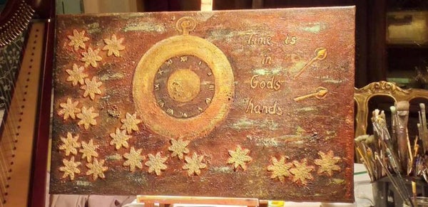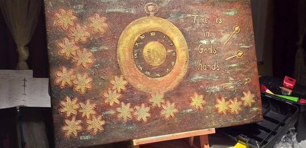 Vlasdoek, geschilderd met acryl & kruiden cassie & kaneelpoeder